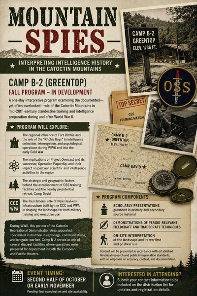 We are currently in the process of planning a Fall “Mountain Spies” program at Camp B-2 (Greentop). This effort is part of an ongoing initiative to interpret the historical record of the Catoctin and South Mountain Corridor and their use for clandestine training, military intelligence, POW interrogation, and national security activities during and after the Second World War.
